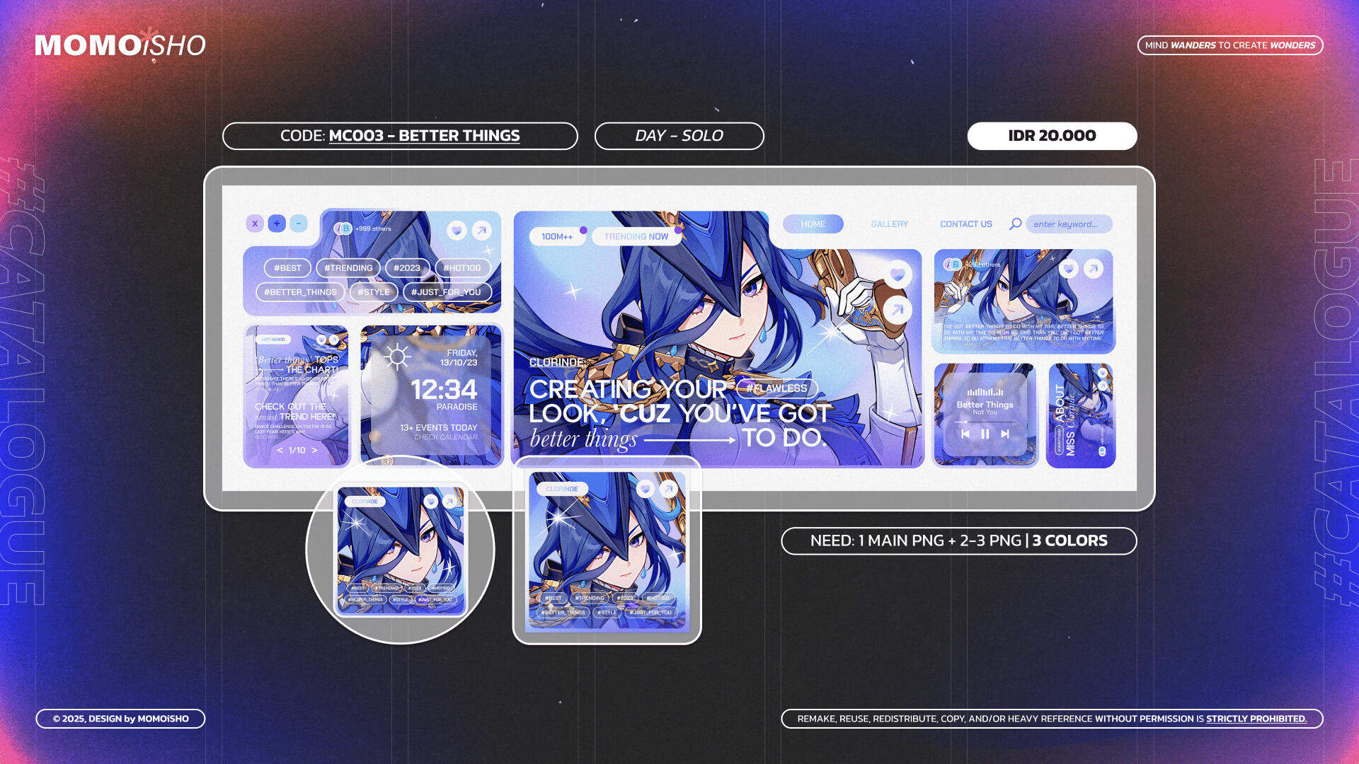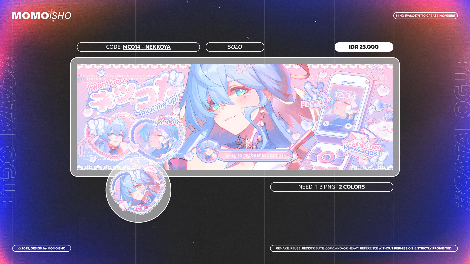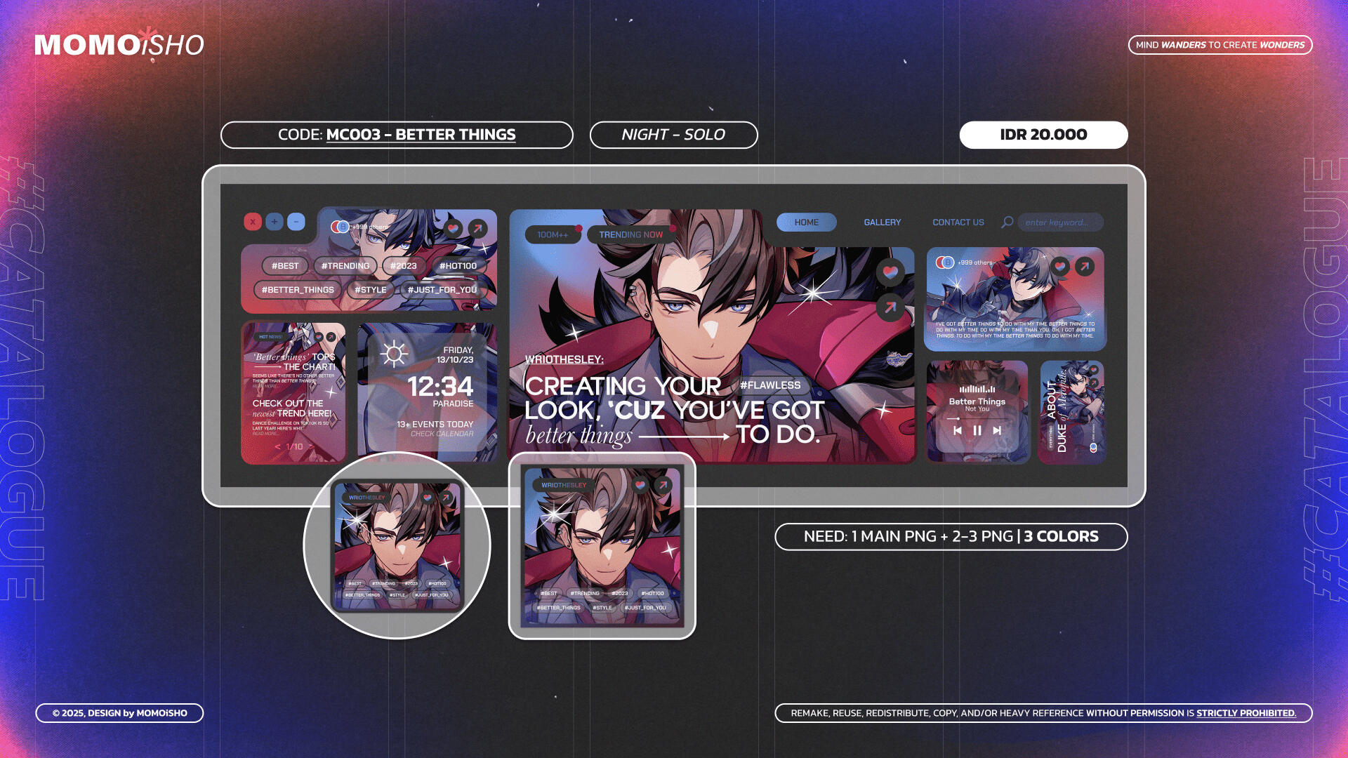 IN RUSH slot is very limited. Duration is counted from the payment confirmation and TRELLO link delivery. Add on IN RUSH and your queue will be moved to top. Please inform MOMO when sending the form if you're interested10. Customers are granted 2x revisions (retext, recolor, re-filter, etc). Add on revisions IDR 3.000,- ($0.3) /revision. Please deliver the revision as detailed and as comprehensive as possible.11. If you pick “colors from MOMO”, please note what kind of colors you're requesting. e.g: want a dominant blue with pastel colors ; want dull colors with purple as the main color ; don't want green ; etc. If there are no requests, MOMO will adjust the recolor according to the render.12. A purchase of 1 Layout will grant customers 1 Loyalty stamp. Customers are allowed to claim MOMO's Loyalty Card reward (if there's any) in this batch.