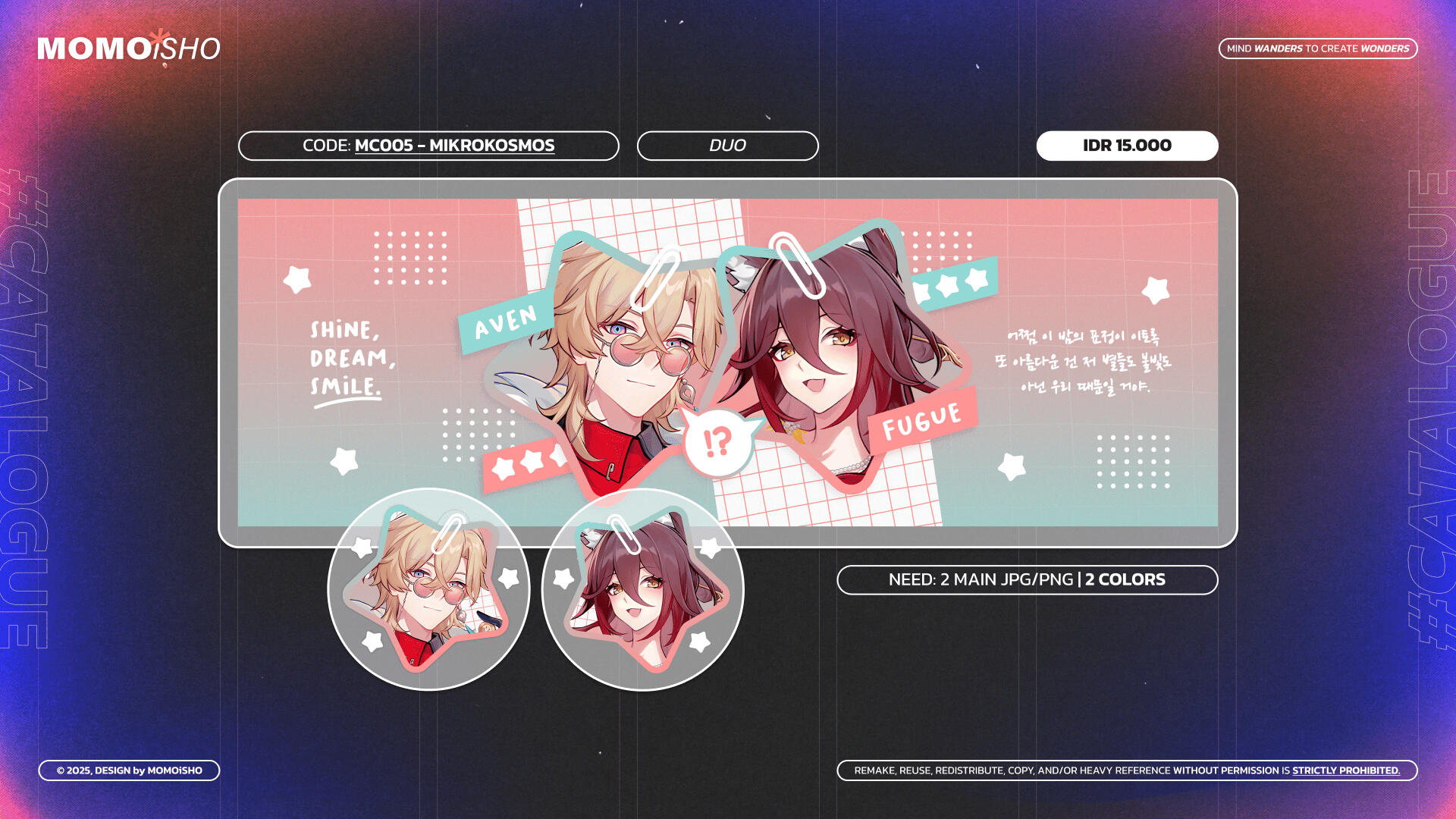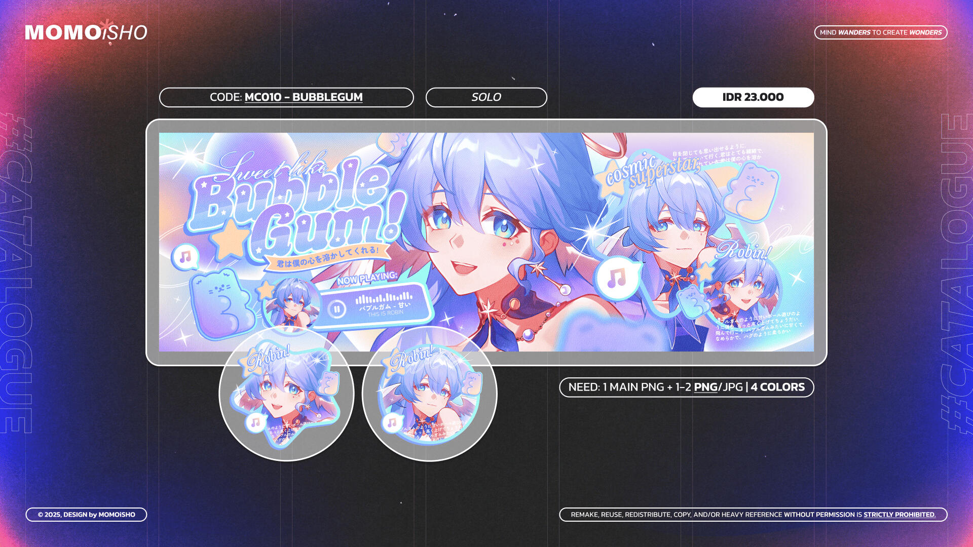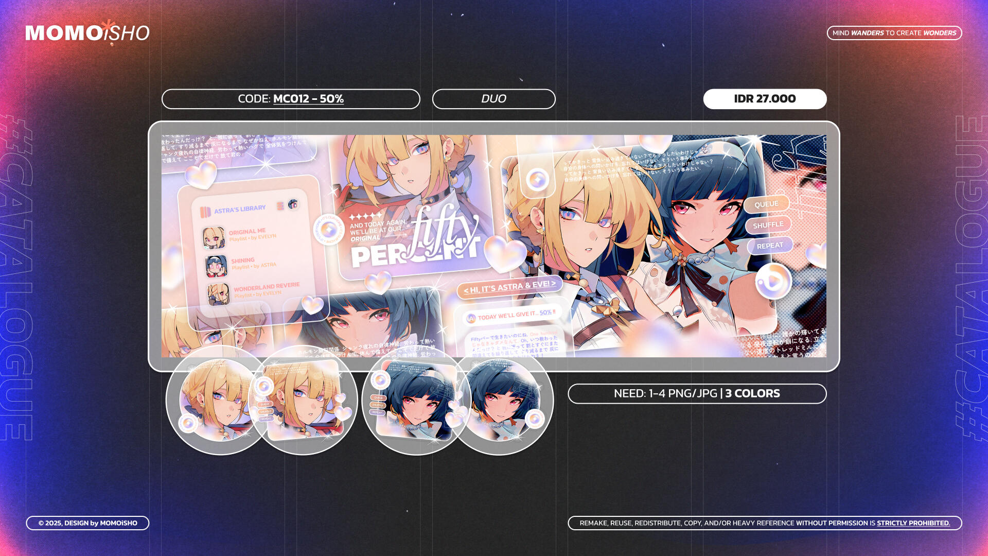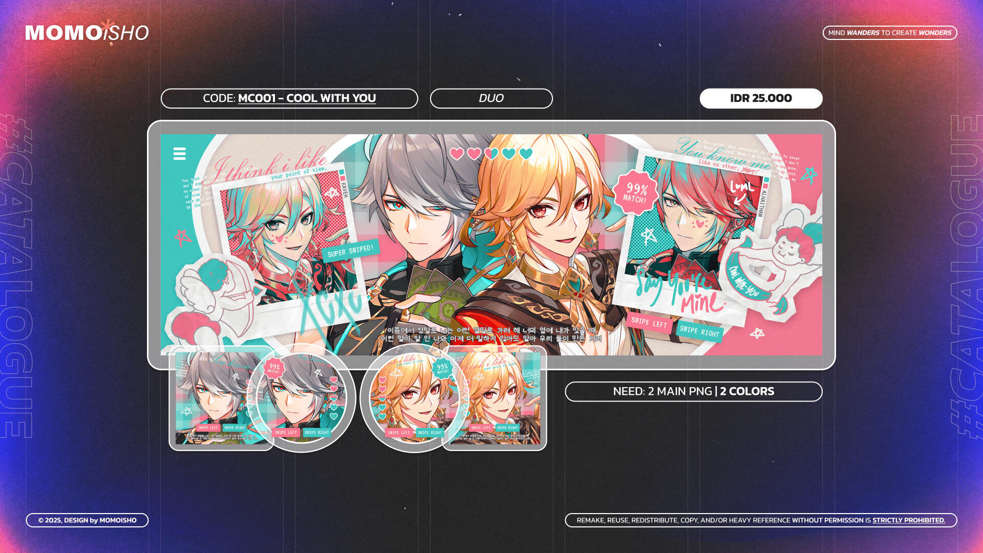 IN RUSH slot is very limited. Duration is counted from the payment confirmation and TRELLO link delivery. Add on IN RUSH and your queue will be moved to top. Please inform MOMO when sending the form if you're interested10. Customers are granted 2x revisions (retext, recolor, re-filter, etc). Add on revisions IDR 3.000,- ($0.3) /revision. Please deliver the revision as detailed and as comprehensive as possible.11. If you pick “colors from MOMO”, please note what kind of colors you're requesting. e.g: want a dominant blue with pastel colors ; want dull colors with purple as the main color ; don't want green ; etc. If there are no requests, MOMO will adjust the recolor according to the render.12. A purchase of 1 Layout will grant customers 1 Loyalty stamp. Customers are allowed to claim MOMO's Loyalty Card reward (if there's any) in this batch.