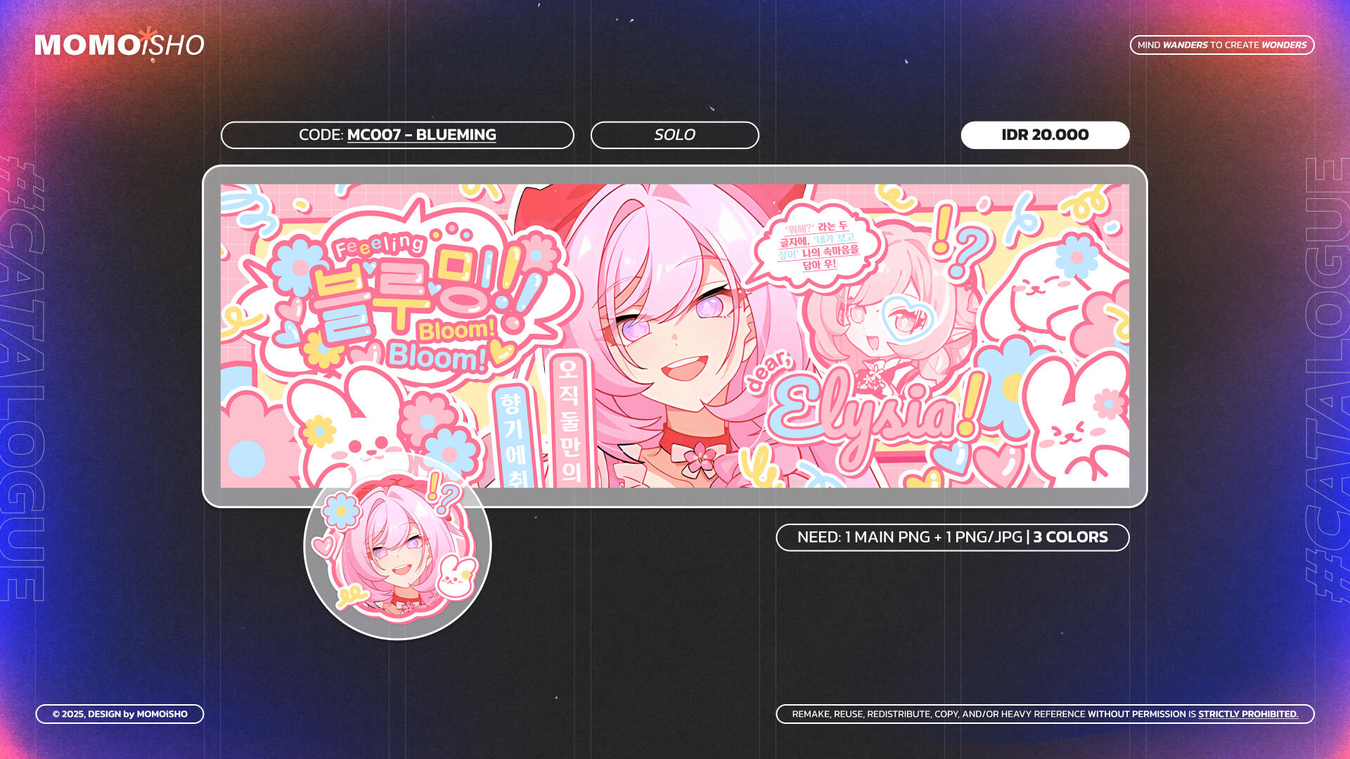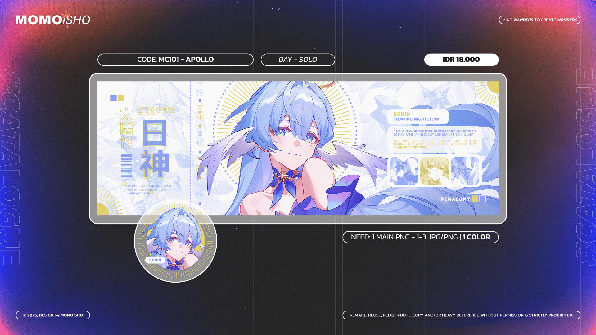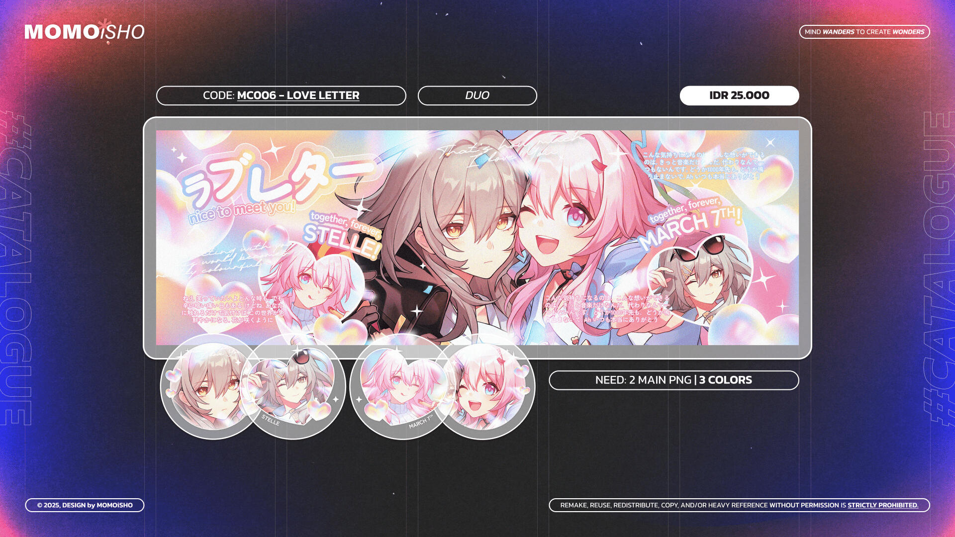 1. By Request slot booking will be done through Google Form. If customers manage to get a slot, MOMO will re-confirm through DM. FILLING THE FORM & GET THE SLOT = MUST TAKE.2. If within 1x24hrs (after MOMO confirmed the slot through DM) customer have yet to submit the FORM or payment proof without informing MOMO, the slot will be passed to the next-in-line.3. Customers are allowed to use proxy.4. Please fill the G-FORM with the amount of slot(s) wanted. One customer = 2 slots max. MOMO will take a TOTAL of 48 SLOTS in this batch.5. Customers are required to provide render (transparent PNG photo) in HD-res. MOMO has prepared filters in accordance to each catalogs, but if the photos from customers are already filtered, MOMO will use it as it is.6. Render booking can be done after MOMO confirmed your slot. (This usually only applies to robin from HSR, do inquire MOMO further if you have any.)7. By Request progress will be queued and updated through Trello after payment is done. ETA for 1 slot is 1-7 days after moving to the “on progress” list in trello. ETA might be longer or shorter depending on MOMO's full-time job and real-life happenings. (MOMO will always keep customers posted through X timeline or trello.) MOMO's Target is to get everything done within 14 days.8. If customer's slot is still "on queue", customers are allowed to alter the form. Please do inform MOMO.9. MOMO accepts IN RUSH order with extra fee: